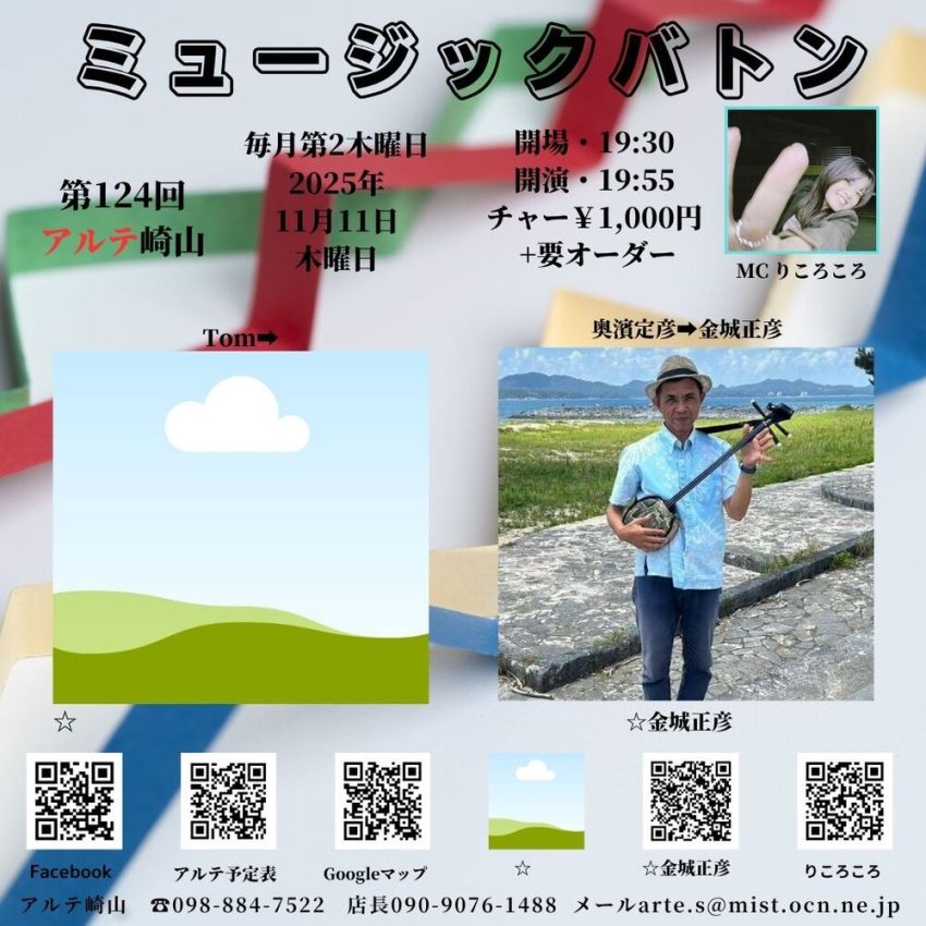 ★第124回アルテミュージックバトン・開場:19時30分/開演:19時55分・出演=奥濱定彦、金城正彦、Tom ・MC:りころころ・会場=アルテ崎山