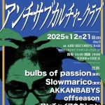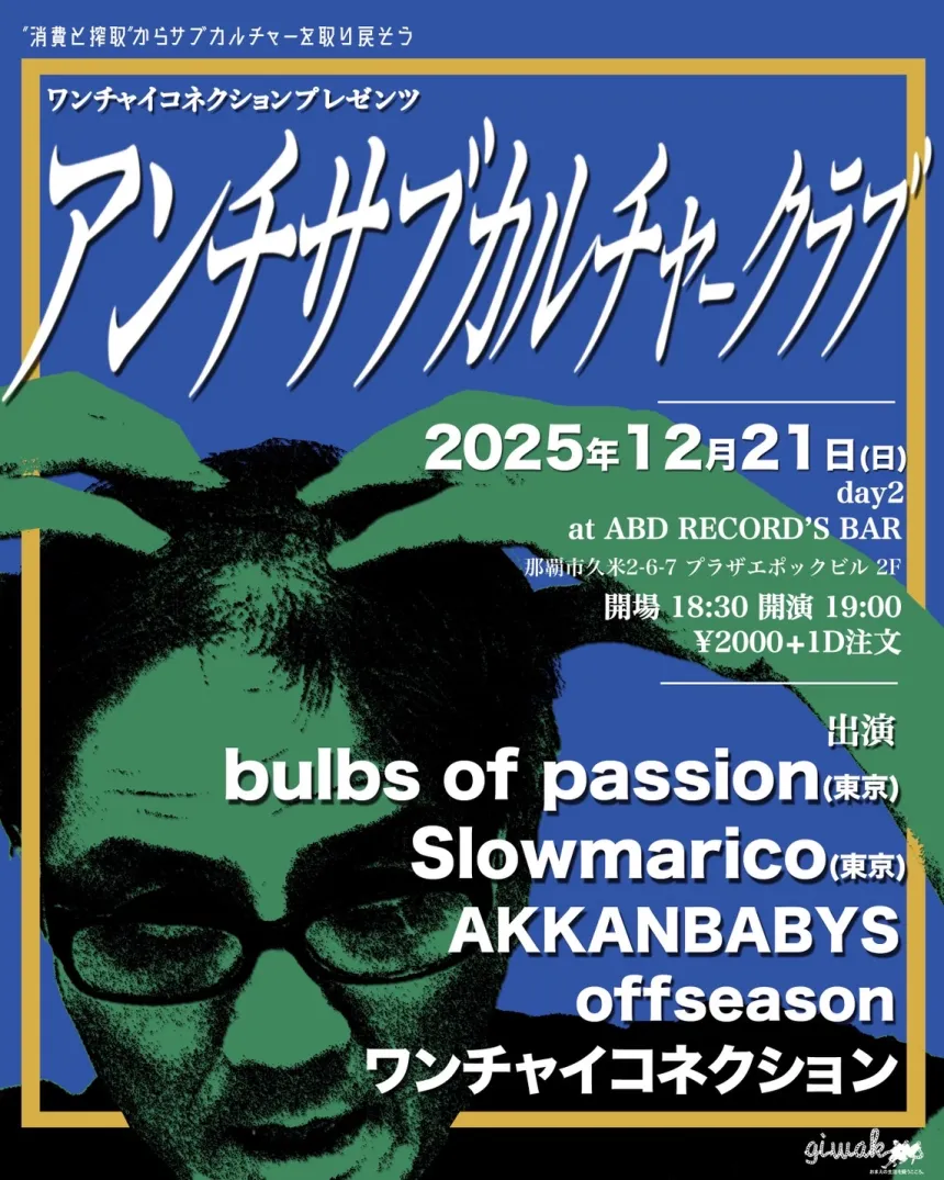 ★ワンチャイコネクションpre.「アンチサブカルチャークラブ DAY2」・開場:18時30分/開演:19時・出演=bulbs of passion(東京)、Slowmarico(東京)、AKKANBABYS、offseason、ワンチャイコネクション・会場=ABD RECORD’S BAR(那覇市久米2-6-7 プラザエポックビル205)