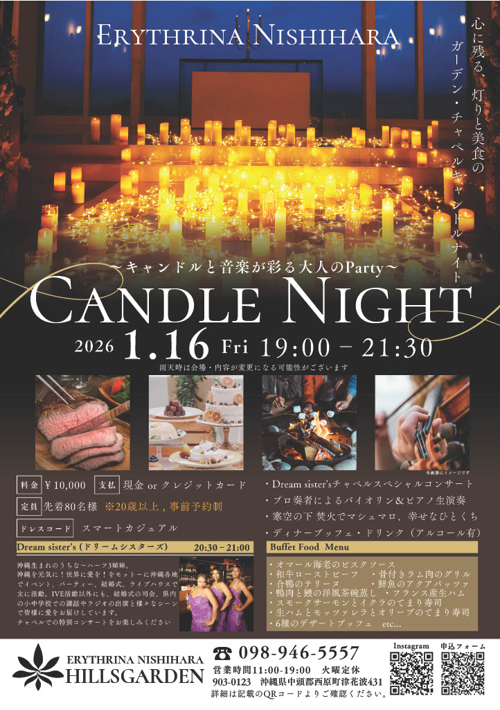 ★エリスリーナ西原ヒルズガーデン キャンドルナイト×ガーデンパーティ・開演:19時~終演:21時30分・エンタメ内容=·Dream sister’sチャペルスペシャルコンサート、プロ奏者によるバイオリン&ピアノ生演奏・会場=エリスリーナ西原ヒルズガーデン(原町津花波431)