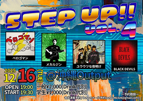 ★STEP UP!! VOL.4・開場:19時/開演:19時30分・出演=ベロゴマン、メカルジン、ユウウツな夜明け、BLACK DEVILS・会場=ライブハウスoutput