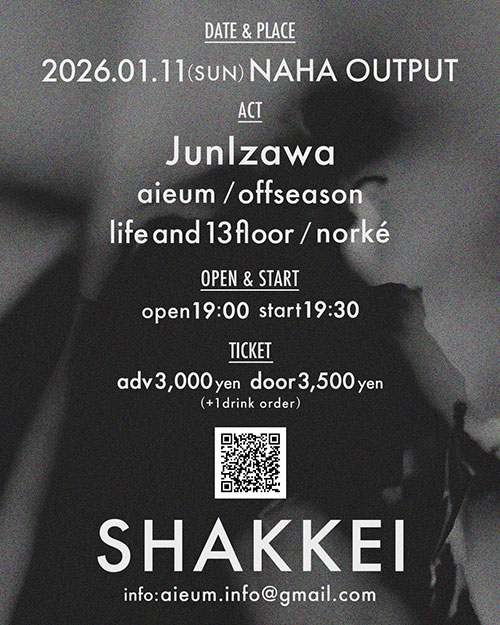 ★shakkei・開場:19時/開演:19時30分・出演=JunIzawa、life and 13floor、norké、offseason、aieum・会場=ライブハウスoutput