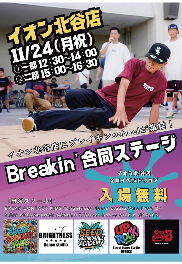 ★Breakin’合同ステージ・【1部】開演:12時30分~終演:14時・【2部】開演:15時~終演:16時30分・会場=イオン北谷店・2階 イベント広場