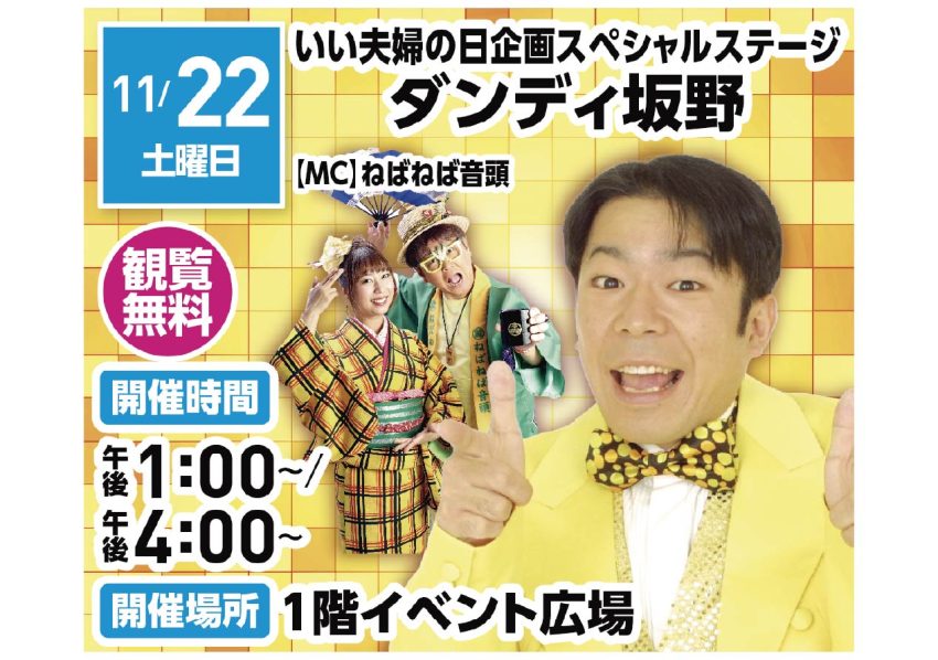 ★いい夫婦の日企画スペシャルステージ ダンディ坂野・【1回目】開演:13時~・【2回目】開演:16時~・MC=ねばねば音頭・会場=イオン南風原店1階 イベント広場