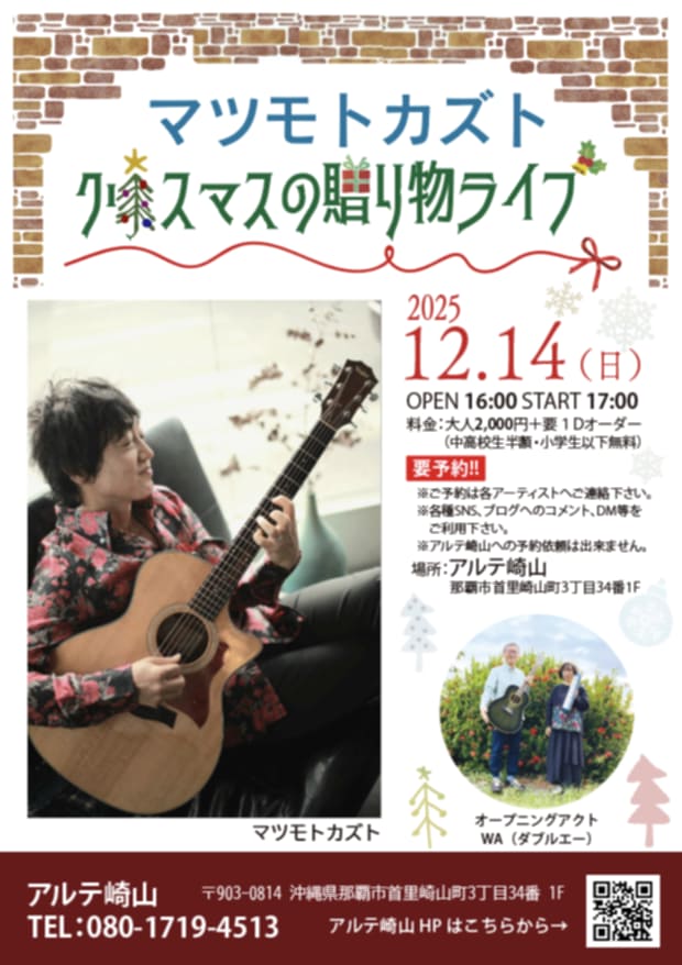 ★マツモトカズト クリスマスの贈り物Lライブ・開場:16時/開演:17時・出演=マツモトカズト、オープニングアクト(ダブルエー)・会場=アルテ崎山