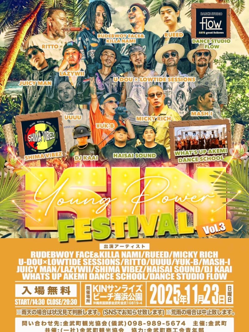 ★ KIN Young Power Festival・START 14時30分/CLOSE 20時30分・出演アーティスト:RUDEBWOY FACE&KILLA NAMI/RUEED/MICKY RICH/U-DOUxLOWTIDE SESSIONS/RITTO/UUUU/YUK-B/MASH-I/JUICY MAN/LAZYWII/SHIMA VIBEZ/HAISAI SOUND/DJ KAAI/WHATS UP AKEMI DANCE SCHOOL/DANCE STUDIO FLOW・会場=KINサンライズビーチ(金武町金武10819ー4)