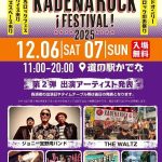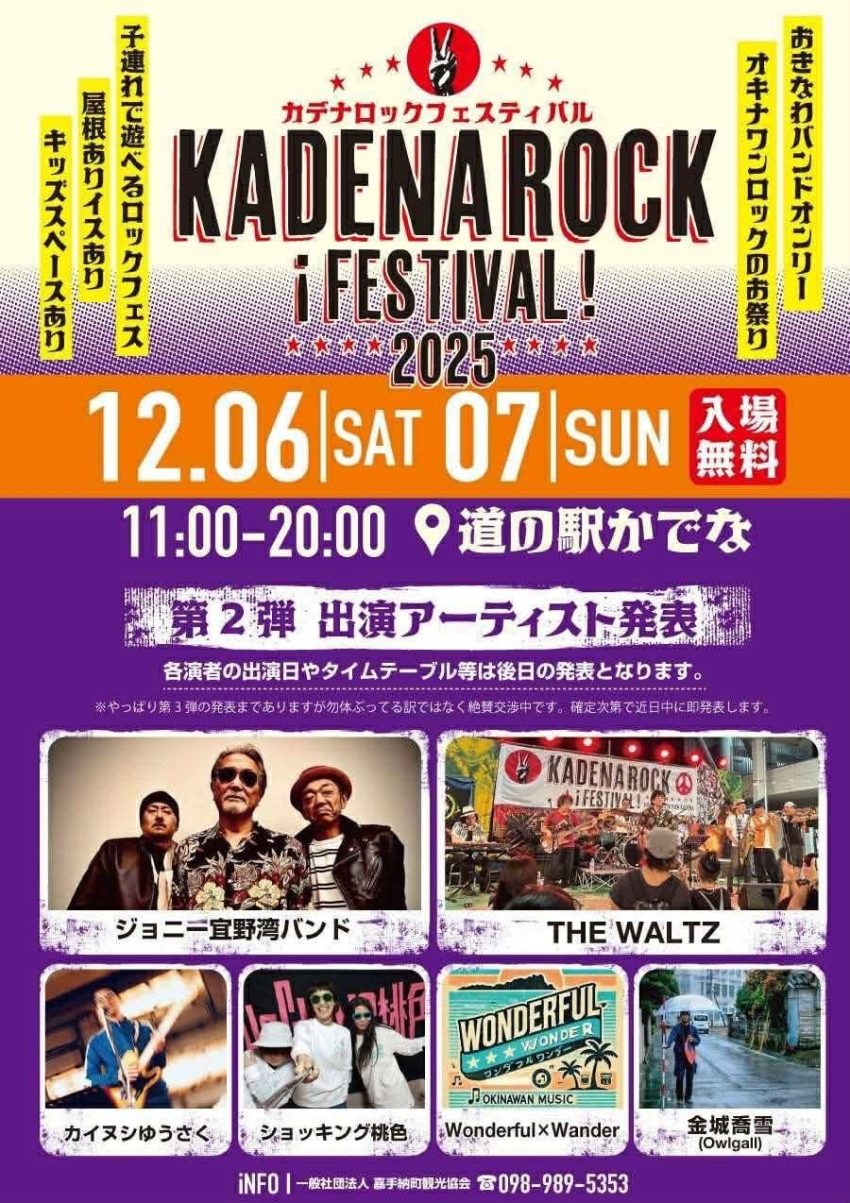 ★カデナロックフェスティバル KADENA ROCK FESTIVAL! 2025・11時~20時・出演=ジョニー宜野湾バンド、THE WALTZ、カイヌシゆうさく、ショッキング桃色、Wonderful Wander、金城西雪 (Owigall)、SSD(スーバースタミナドリンクス)、INDIAN-Hi、地獄車、ナオキ屋&THE 愛愛伝伝、メカルジン、DUTY FREE SHOPP.、KITOKA、ヨシムラタカシバシド、offseason、GO BANANAS・会場=道の駅かでな