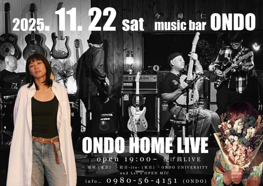 ★ONDO HOME LIVE・開場:19時/開演:19時30分・出演=優理 (東京) 、結音-ito- (東京)、ONDO UNIVERSITY ・会場=今帰仁村・Music bar ONDO