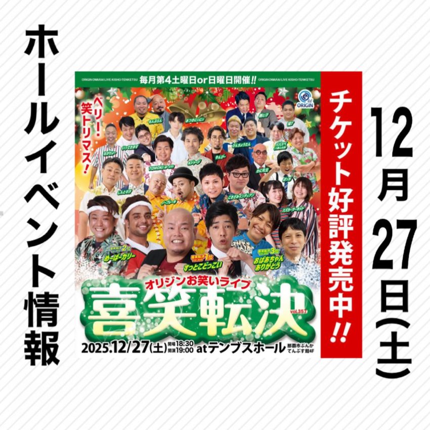 ★オリジンお笑いライブ・喜笑転決・開場:18時30分/開演:19時・出演=ババスペ(石垣支部)、いってきます、いんとすけ、もんぶらん、糠と汗、びんちょうたん、ぼっち、やんぴー、あつぎにいにり、わに先生、TOMOKI(厨一文字)、こきざみインディアン、Kジャージ、ススカサーキット、めーばーカリー、ノーブレーキ、すつとこどうこい・会場=てんぶす那覇・テンブスホール