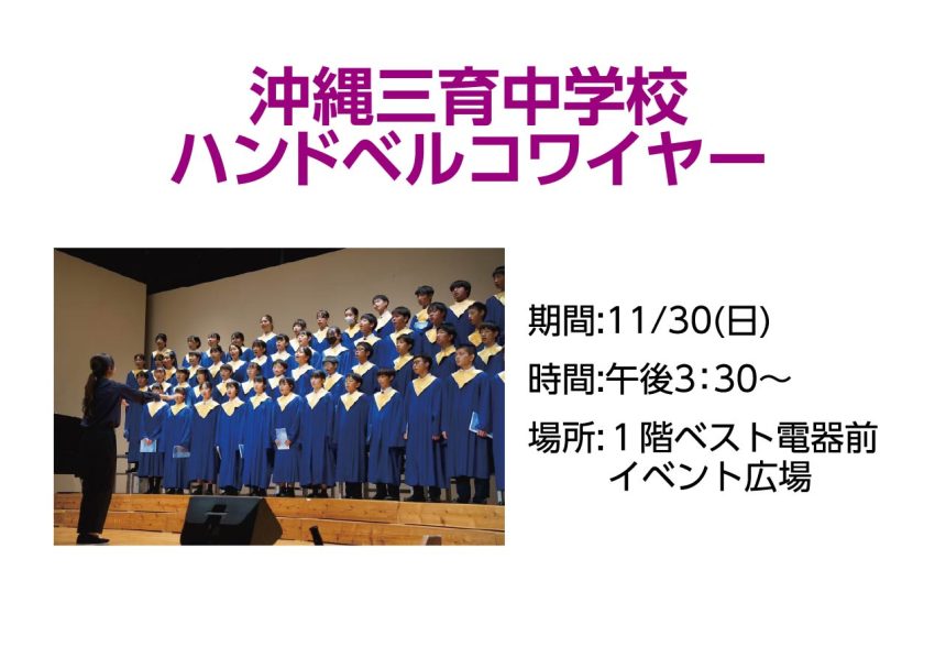 ★沖縄三育中学校 ハンドベルコワイヤー・開演:15時30分~・会場=イオン名護店1階ベスト電器前イベント広場