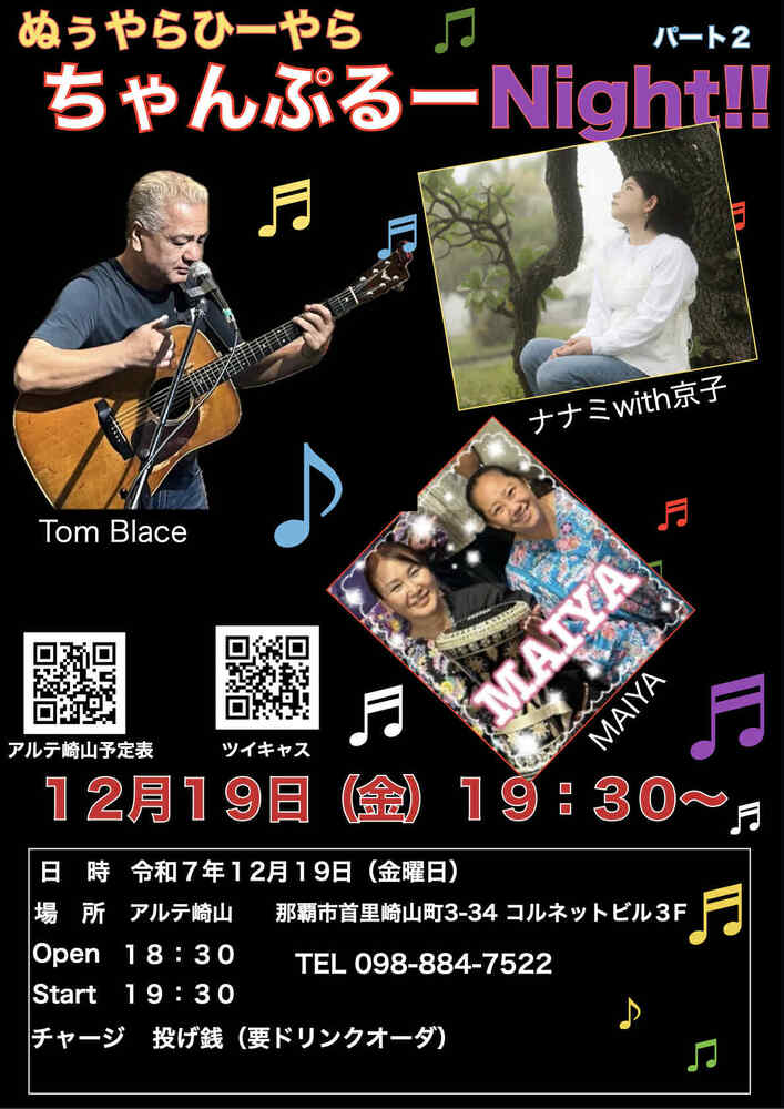 ★ぬぅやらひーやら ちゃんぷるーNight パート2・開場:18時30分/開演:19時30分・Tmo Blace、ナナミwith京子、MAIYA・会場=アルテ崎山