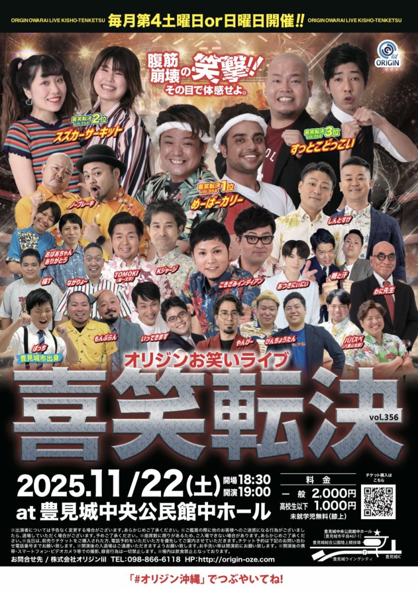 ★オリジンお笑いライブ・喜笑転決・開場:18時30分/開演:19時・出演=スズカーサーキット、めーばーカリー、ノーブレーキ、おばあちゃんありがとう、ながりょー、TOMOKI (リーチ)、Kジャージ、こきざみインディアン、あつきにいにい、すっとこどっこい、しんとすけ、糖と汗、わに先生、もんぶらん、いってきます、やんぴー、びんちょうたん・会場=豊見城中央公民館中ホール
