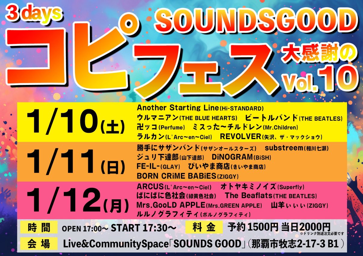 ★コピフェス 大感謝祭の Vol.10・開場:17時/開演:17時30分・出演=ARCUS (L’Arc~en~Ciel)、オトヤキミノイズ (Superfly)、ぱにぱに色社会(緑黄色社会)、The Beaflats (THE BEATLES)、Mrs.GooLD APPLE (Mrs.GREEN APPLE)、山羊いいい (ZIGGY)、ルルノグラフィティ(ポルノグラフィティ)・会場=SOUNDS GOOD