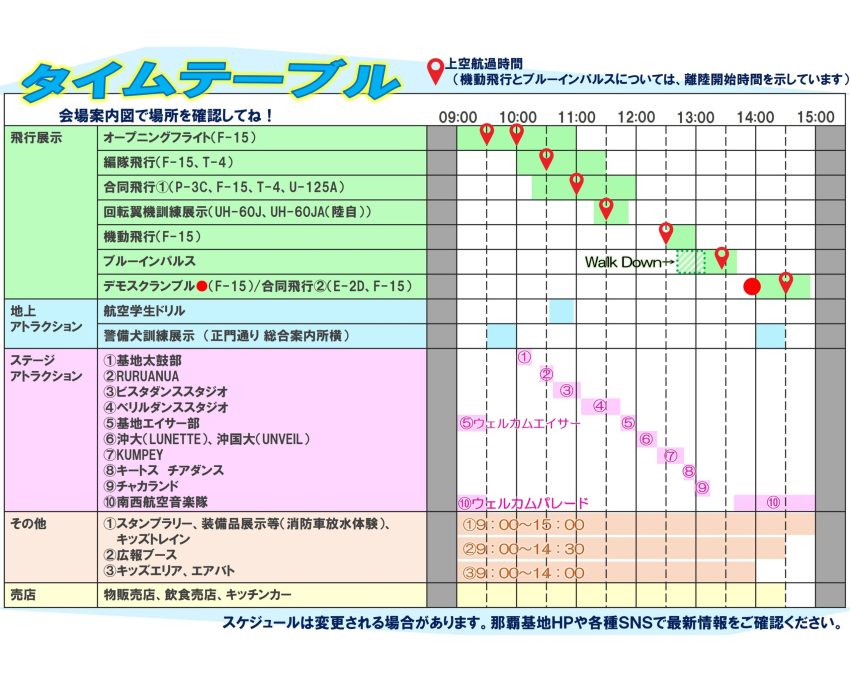 ★美ら島エアフェスタ2025・9時~15時・ステージアトラクション出演者=基地太鼓部、RURUANUA、ビスタダンススタジオ、ベリルダンススタジオ、基地エイサー部:ウエルカムエイサー、沖大(LUNETTE)、沖国大(UNVEIL)、KUMPEY、キートス チアダンス、チャカランド、南西航空音楽隊:ウエルカムパレード・会場=航空自衛隊那覇基地