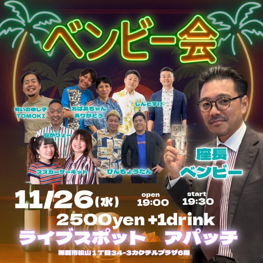 ★ベンビー会・開場:19時/開演:19時30分・出演=笑いの申し子 TOMOKI、おばあちゃんありがとう、なかりょう、しんとすけ、スズカーサーキット、ぴんちょーたん・座長:ベンビー・会場=Live Spot Apache
