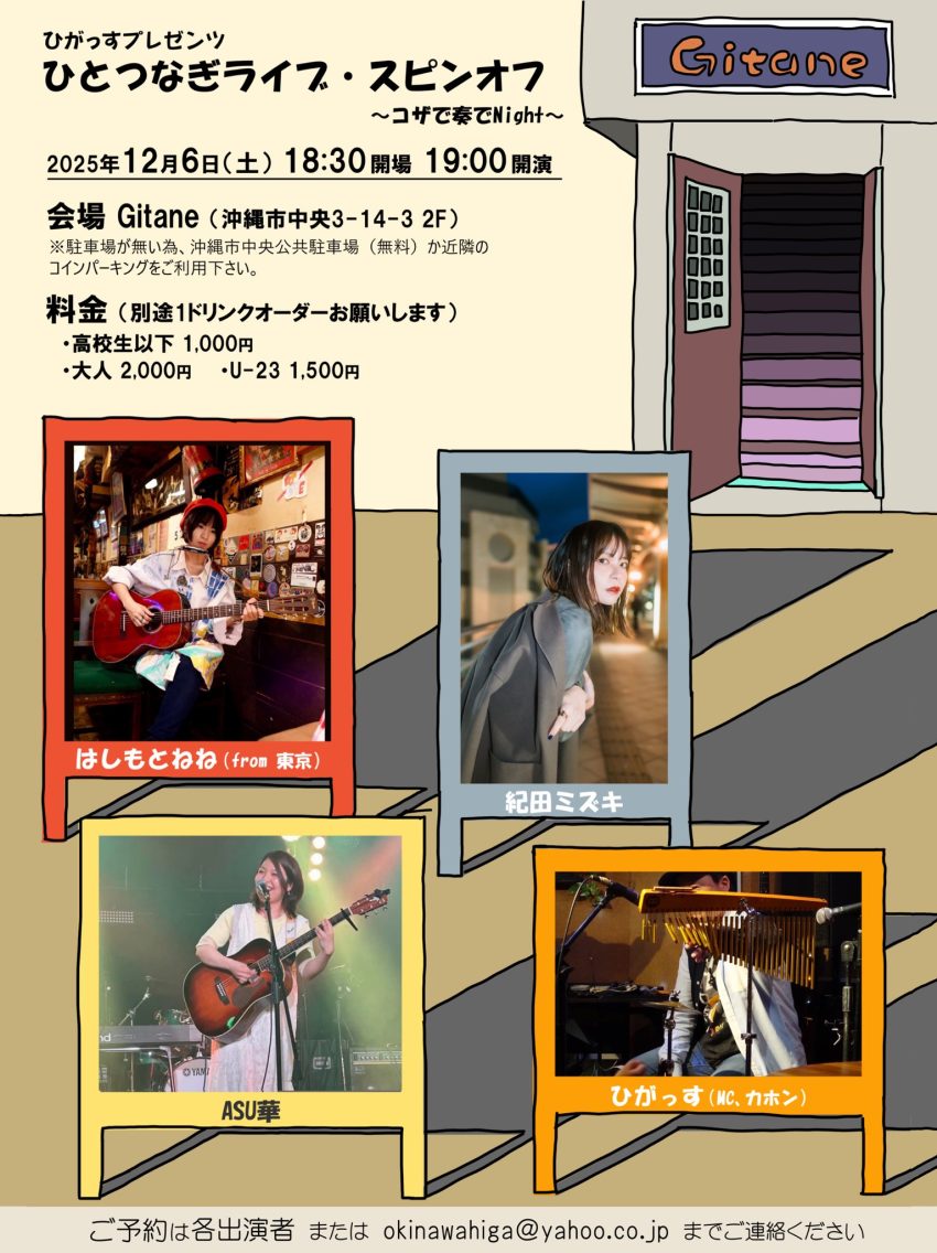 ★ひがっすプレゼンツひとつなぎライブ・スピンオフ~コザで奏でNight~・開場:18時30分/開演:19時・出演=はしもとねね (from 東京)、紀田ミスキ、ASU華、ひがっす(MC、カホン)・会場=Gitane(沖縄市中央3-14-3 2F)
