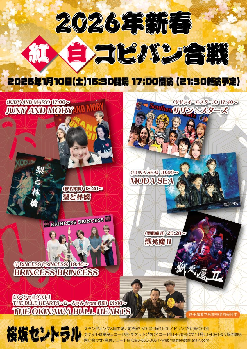 ★2026年新春紅白コピバン合戦・JUNY AND MORY(JUDY AND MARY)17時〜・ サザン☆スターズ(サザンオールスターズ)17時40分〜・ 梨と林檎(椎名林檎)18時20分〜・ MODA SEA(LUNA SEA)19時〜・BRINCESS BRINCESS(PRINCESS PRINCESS)19時40分〜・ 獣死魔Ⅱ(聖飢魔II)20時20分〜・THE OKINAWA BULL HEARTS(THE BLUE HEARTS)21時〜・会場=桜坂セントラル