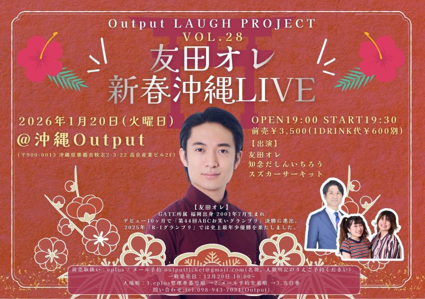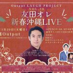 ★友田オレ 新春沖縄LIVE ・開場:19時/開演:19時30分・出演=友田オレ、知念だしんいちろうさん、スズカーサーキット・会場=ライブハウスoutput