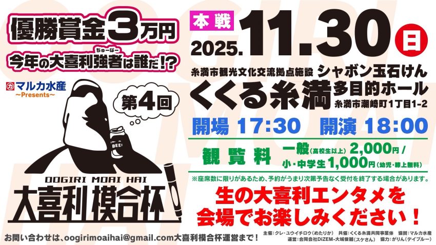 ★第4回 #大喜利模合杯 inくくる糸満 本選・開演:17時30分~終演:18時・本選出場者=下地となり、やんびー、武藤、寿パンチ、TOKU 、サンフランちんすこう、常盤坂もず、赤嶺、照屋、くうき、椎田拳銃、なえこ103・本戦招待枠=ハチカイ警備員、にょうま、花トレイン・会場=シャボン玉石鹸くくる糸満