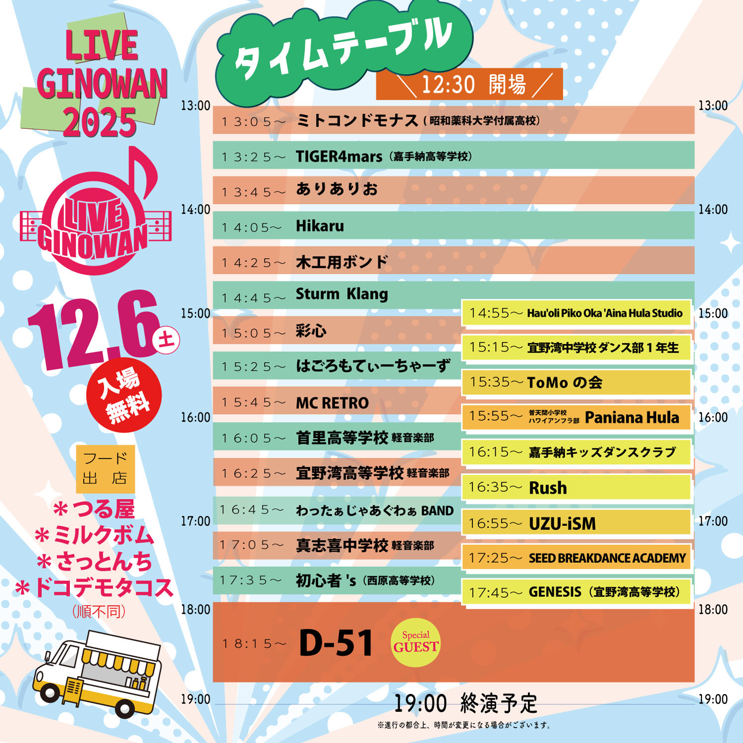 ★LIVE GINOWAN 2025・開演:13時~・出演=・ミトコンドモナス(昭和薬科大学付属高校)、TIGER4mars (嘉手納高等学校)、ありありお、Hikaru、木工用ボンド、Sturm Klang、彩心、はごろもてぃーちゃーず、MC RETRO、首里高等学校 軽音楽部、宜野湾高等学校 軽音楽部、わったぁじゃあぐわぁ BAND、真志喜中学校 軽音楽部、初心者’s(西原高等学校)、Hau’oli Piko Olika ‘Aina Hula Studio、宜野湾中学校ダンス部1年生、ToMoの会、普天間小学校ハワイアンフラ部 Paniana Hula嘉手納、嘉手納キッズダンスクラブ、Rush、UZU-ISM、SEED BREAKDANCE ACADEMY、GENESIS (宜野湾高等学校)・会場=宜野湾市民会館 前広場