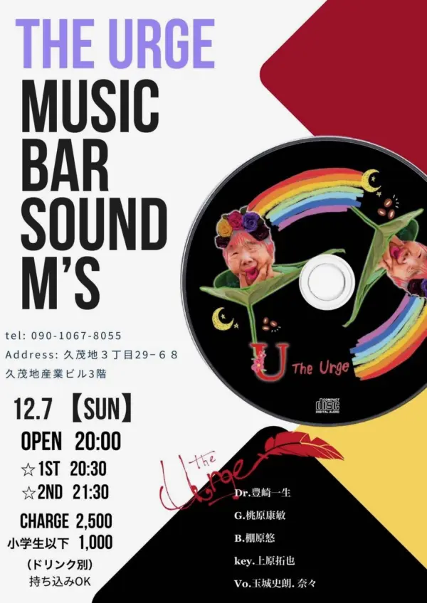 ★THE URGE・開場:20時/開演:20時30分・MEMBER=豊崎一生(dr)/桃原康敏(gt)/棚原悠(bs)/上原拓也(key)/玉城史朗(vo)/奈々(vo)・会場=Live Music Bar SOUND M’S