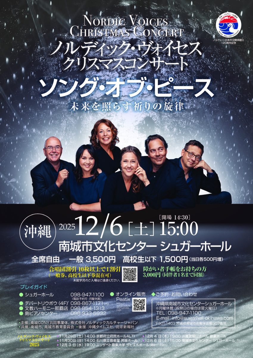 ★ノルディック・ヴォイセス クリスマスコンサート・開場:14時30分/開演:15時・出演=トーネ・エリサベト・ブローテン(ソプラノ)、イングリ・ハンケン(ソプラノ)、エッバ・リード(メゾ・ソプラノ)、ペール・クリスティアン・アムンドレー(テノール)、フランク・ハヴレイ(バリトン)、ロルフ・マグネ・シュミット・アッセル(バス)・会場=南城市文化センターシュガーホール