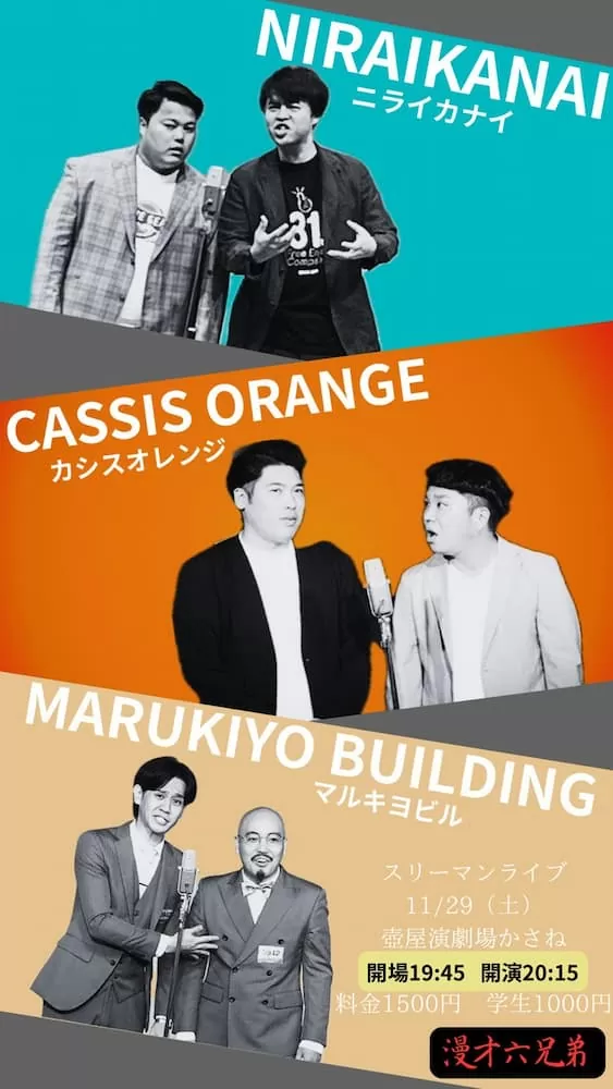 ★スリーマンライブ・開場:19時45分/開演:20時15分・出演=ニライカナイ、カシスオレンジ、マルキヨビル・会場=壺屋演劇場かさね