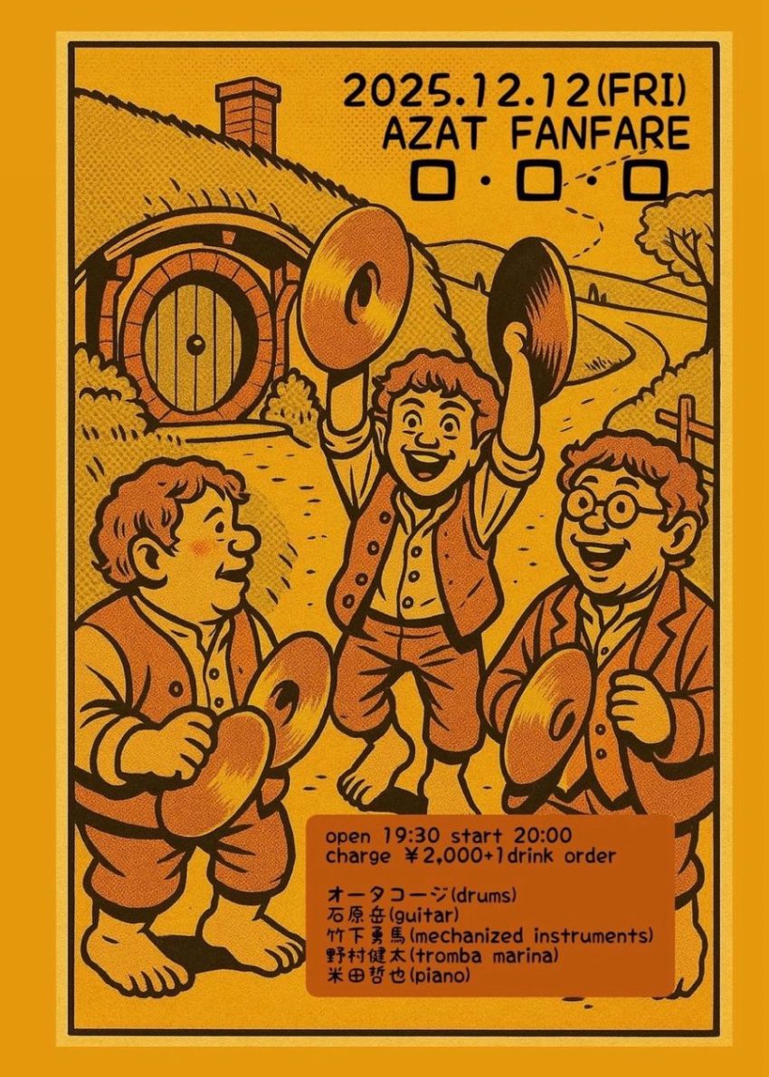 ★□・□・□・開場:19時30分/開演:20時・出演=オータコージ(drums)、石原岳(guitar)、竹下勇馬(mech instruments)、野村健太(tromba marina)、米田哲也(piano)・会場=AZAT FANFARE