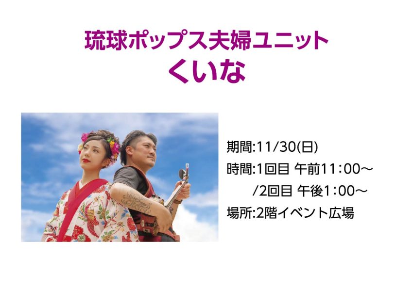 ★琉球ポップス夫婦ユニット くいな・【1回目】開演:11時~・【2回目】開演:13時~・会場=イオン具志川店・2階イベント広場