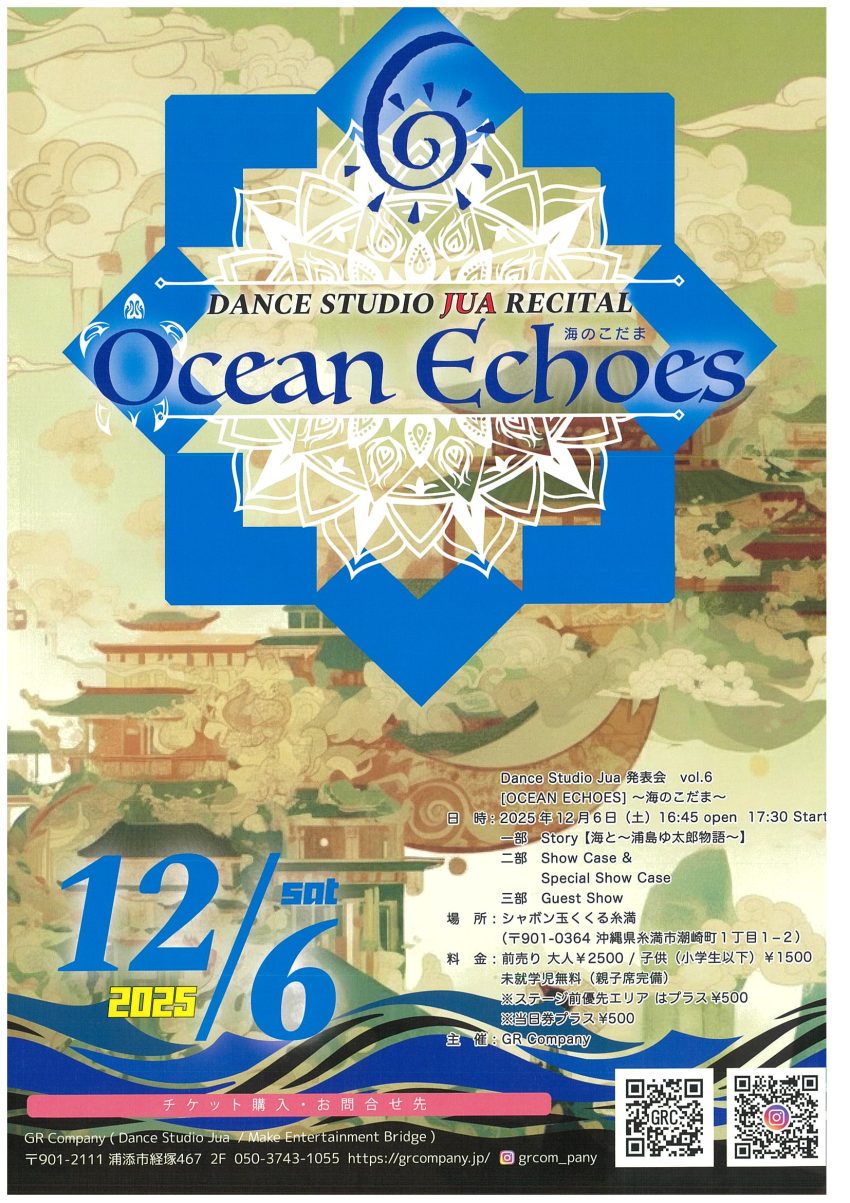 ★Dance Studio Jua Recital vol.6・開場:16時45分/開演:17時30分~終演:20時30分・一部 Story【海と~浦島ゆ太郎物語~】・二部 Show Case &Special Show Case・三部 Guest Show・Guest:Hollywood Yong Mel、SHION & SENRI、Yohane & Kino、HIJIRI × MADOKA X AKARI X LUNA、はしやすめ、GURI feat.GAPJ+ (Kazuki/KOKOA/Yua☆)・会場=シャボン玉石鹸くくる糸満