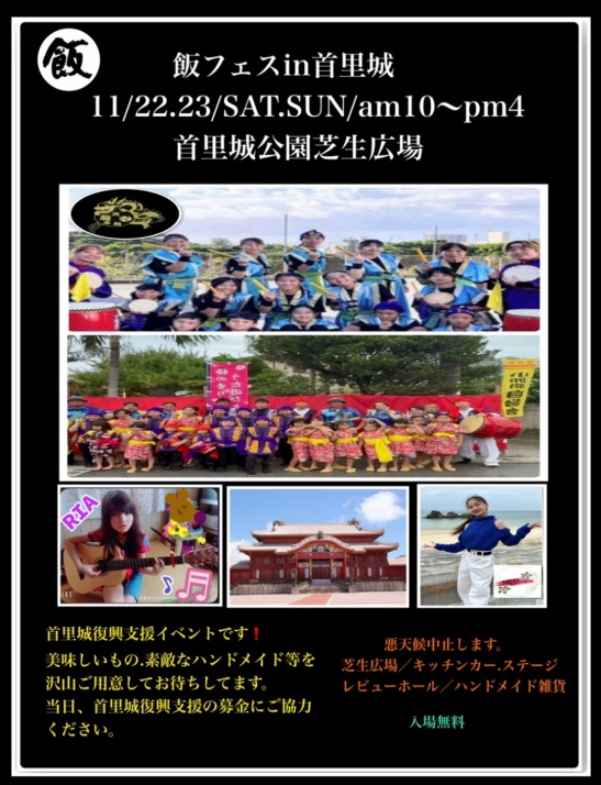 ★飯フェス in 首里城公園・ステージイベント・12時~:RIA(LIVE)、12時30分~:西原町小那覇子ども会、13時~:Hi-bisu(ダンス)、13時30分~:うるま天龍太鼓、14時~:西原町小那覇子ども会・会場=首里城公園・首里杜館芝生広場