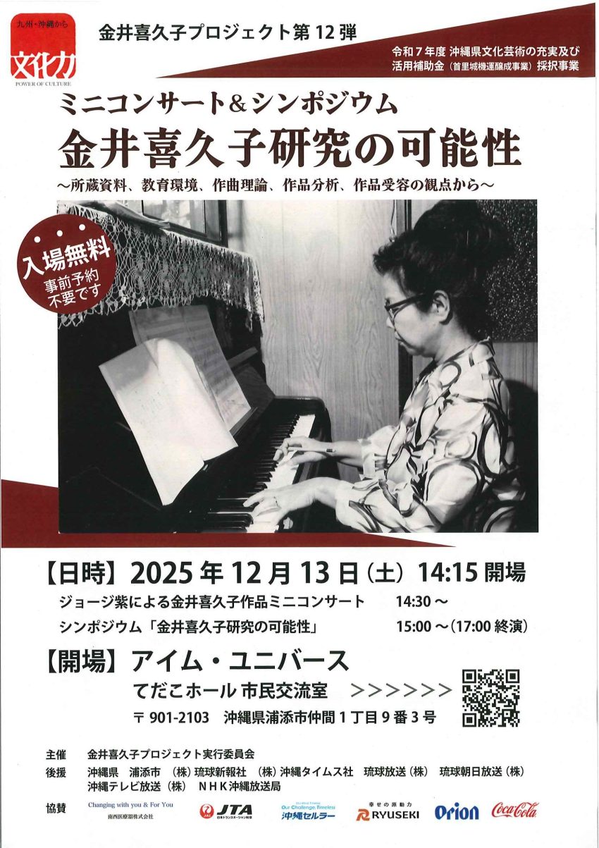★ミニコンサート&シンポジウム 金井喜久子研究の可能性・開場:12時45分/ジョージ紫による金井喜久子作品ミニコンサート=開演:20時~・シンポジウム「金井喜久子研究の可能性」開演:15時~終演:17時・登壇者及び出演者=内田順子、仲辻真帆、西田紘子、河端真依子、上江田博史、ジョージ紫、比嘉悦子、三島わかな・【総合司会】 宮城 さつき・会場=アイム・ユニバースてだこホール・市民交流室