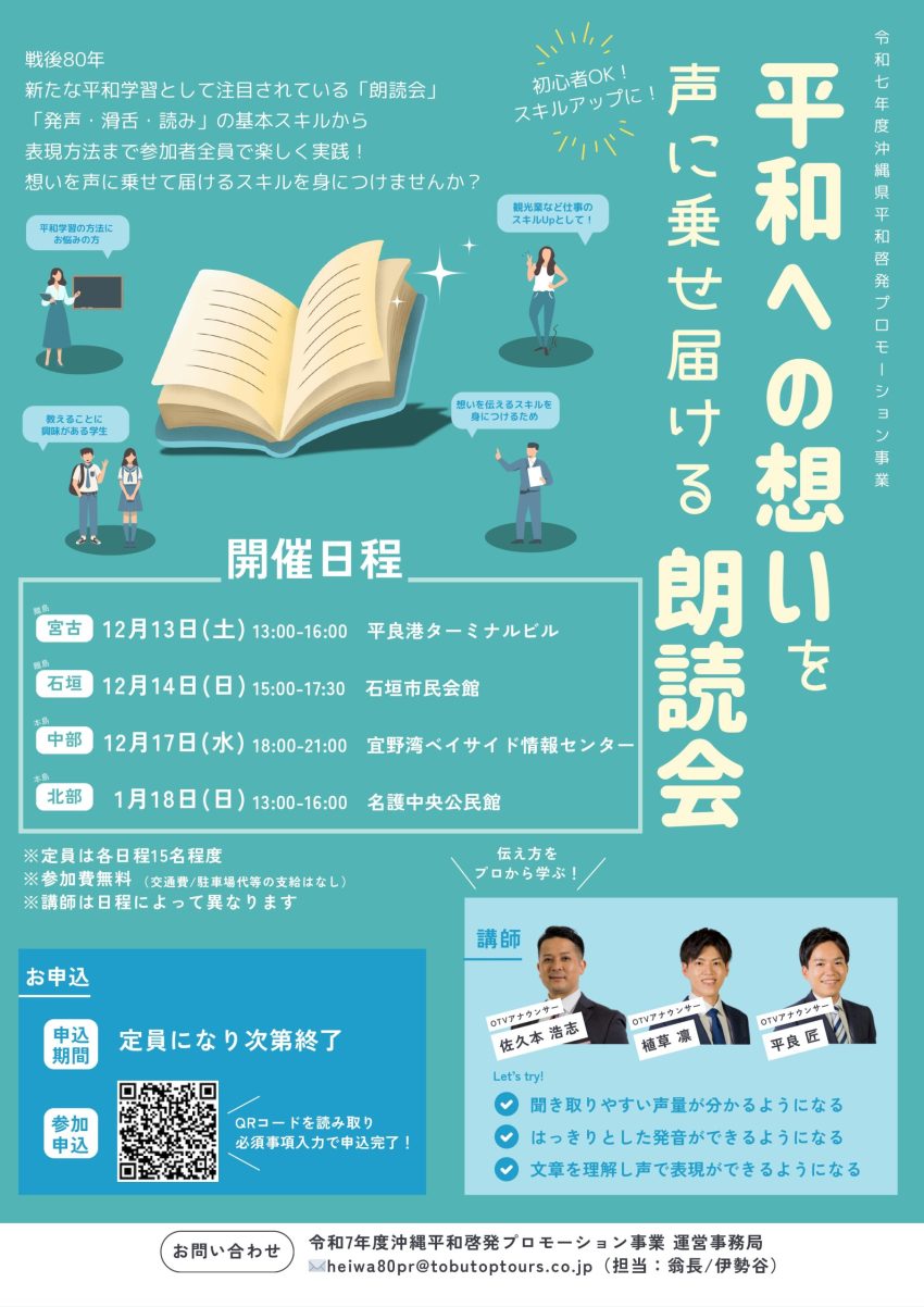 ★平和への想いを声に乗せ届ける朗読会・13時~16時・講師=OTVアナウンサー:佐久本 浩志、OTVアナウンサー:植草凍、OTVアナウンサー:平良匠・会場=平良港ターミナル