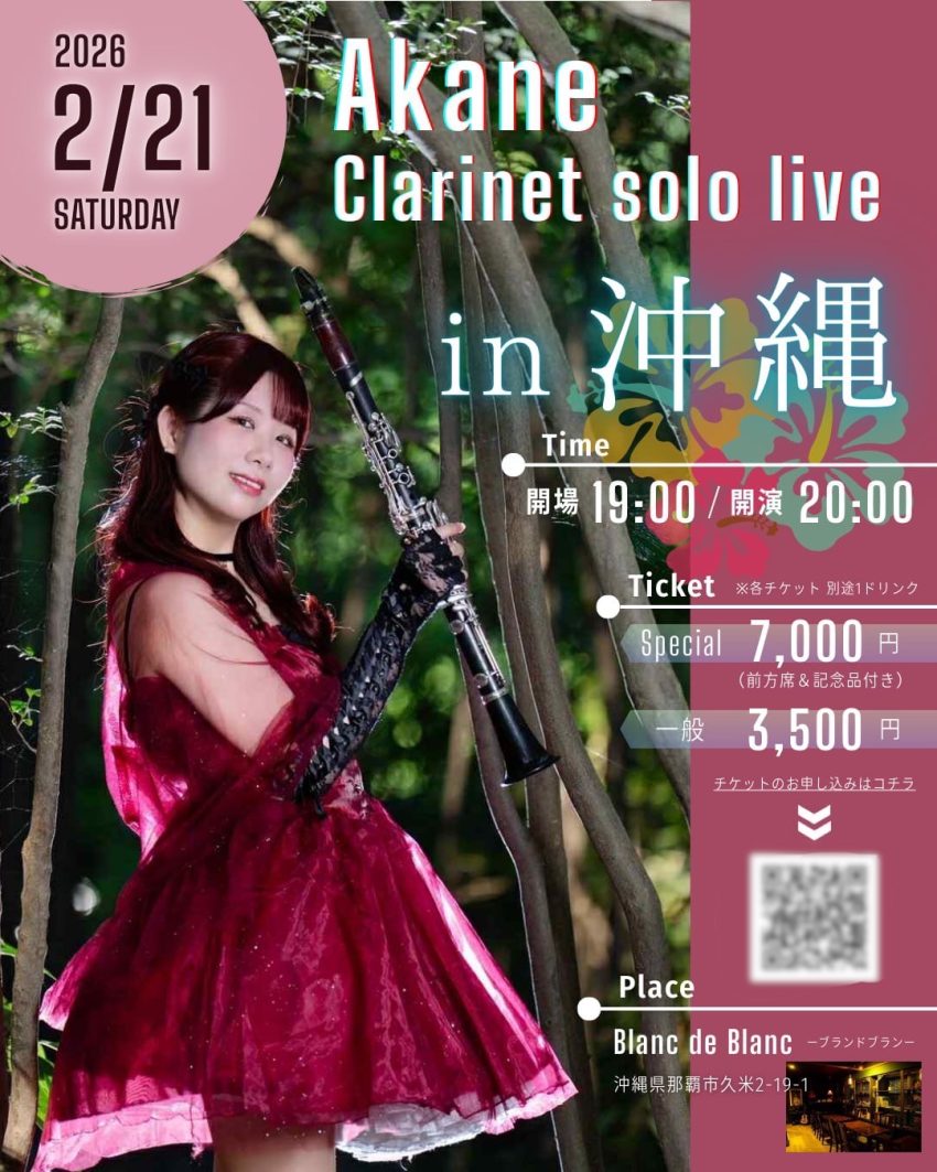★Akane Clarinet Solo Live in 沖縄・開場:19時/開演:20時・出演=Akane・会場=Blanc de Blanc(那覇市久米2丁目19−1)