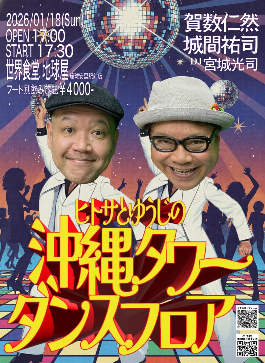 ★ヒトサとゆうじの沖縄タワーダンスフロア・開場:17時/開演:17時30分~終了:19時30分・出演=賀数仁然(琉球歴史文化研究家)、城間祐司(ゆうりきや〜)・DJ:宮城光司・会場=世界食堂地球屋 琉球安里駅前店(那覇市安里388)