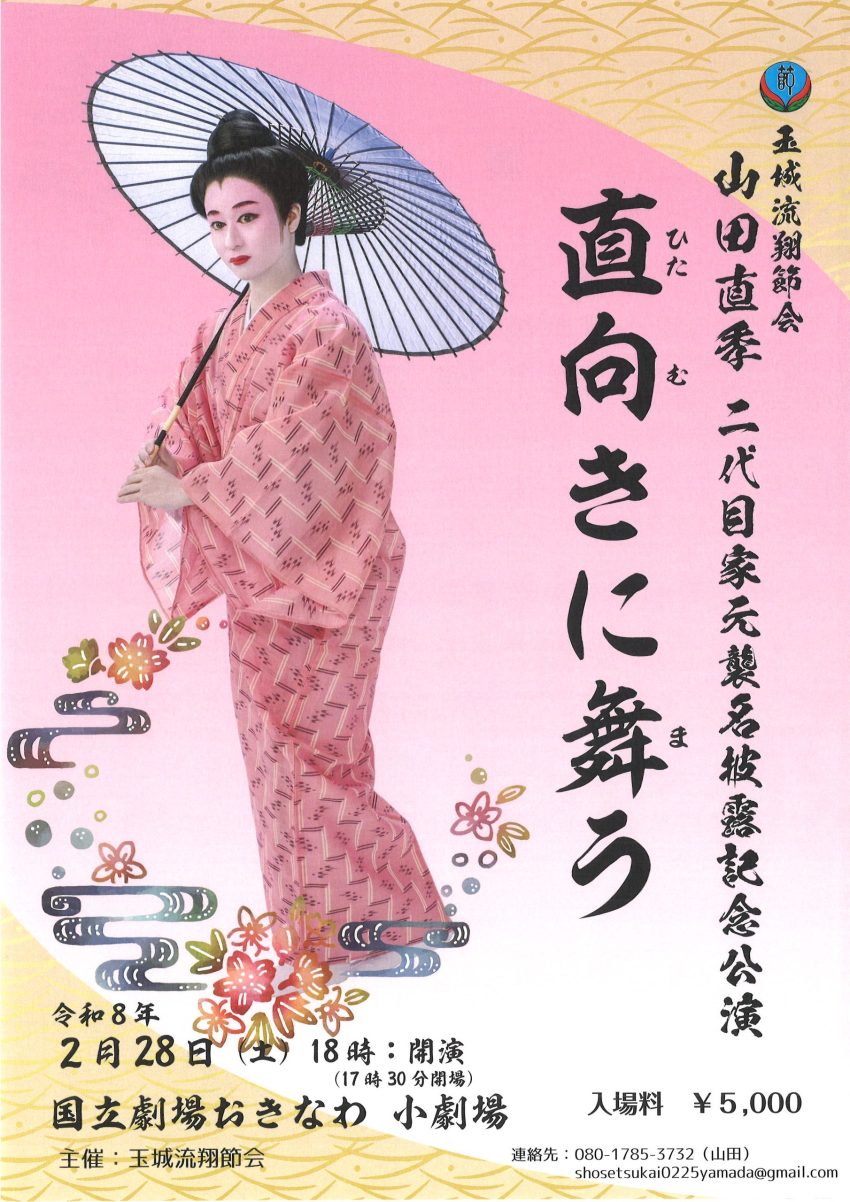 ★玉城流翔節会 山田直季 二代目家元襲名披露記念公演 直向きに舞う・開場:17時30分/開演:18時・出演=山田直季、神山穂紫乃、上原美希子、大城美由紀、松原和美、松原和美・会場=国立劇場おきなわ・小劇場