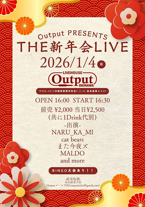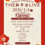 ★Output PRESENTS THE新年会LIVE・開場:19時30分/開演:20時・出演=NARU_KA_MI、cat bears、また今夜ズ、MALDO、その他調整中・会場=ライブハウスoutput