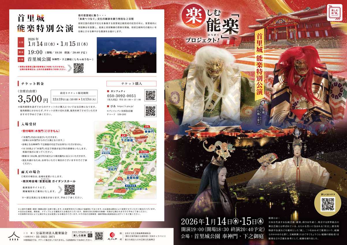 ★楽しむ能「楽」プロジェクト! 首里城 能楽特別公演・開場:18時30分/開演:19時~終演:20時40分・オープニングパフォーマンス半能=シテ(白獅子):坂井音雅、ツレ(赤獅子):坂井音晴・解説=観世喜正・能=シテ(海人/龍女):金剛龍謹、子方(房前大臣):金剛謹一朗・会場=首里城公園 奉神門・下之御庭(しちゃぬうなー)