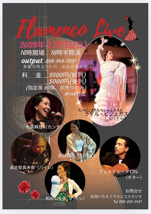 ★Flamenco Live・開場:16時/開演:16時30分・出演=バイレ・ラケル・ビジェガス / 池谷香名子 / 具志堅真未香 / 松田いちえ・カンテ・水落麻理・会場=ライブハウスoutput