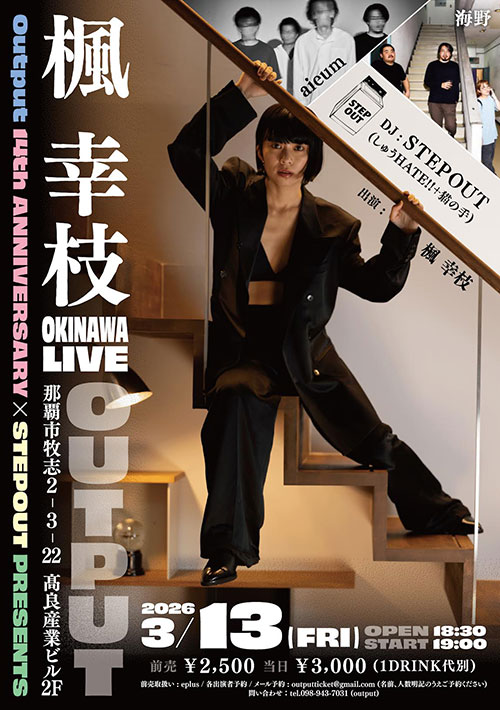 ★Output 14th ANNIVERSARY × STEPOUT PRESENTS 楓 幸枝 OKINAWA LIVE・開場:18時30分/開演:19時・楓幸枝、aieum、海野、DJ:STEPOUT(しゅうHATE!! + 猫の手)・会場=ライブハウスoutput