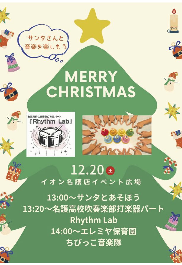 ★サンタさんと音楽を楽しもう・開演:13時=サンタとあそぼう・開演:13時20分=名護高校吹奏楽部打楽器パート Rhythm Lab・開演:14時= エレミヤ保育園 ちびっこ音楽隊・会場=イオン名護店1階ベスト電器前イベント広場