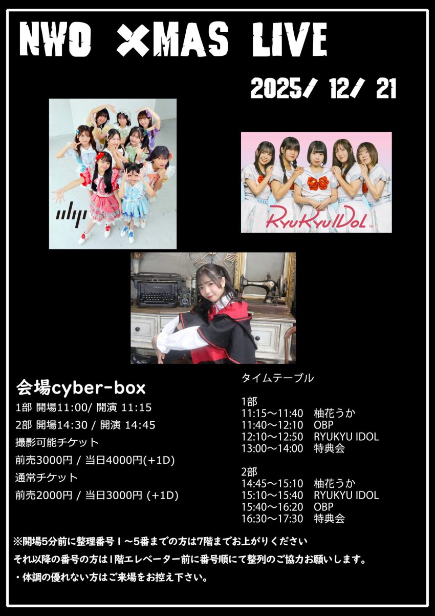 ★NWO Xmas LIVE・【1部】開場:11時/開演:11時15分・【2部】開場:14時30分/開演:14時45分・出演=OBP、RYUKYU IDOL、柚花うか・会場=Cyber-Box