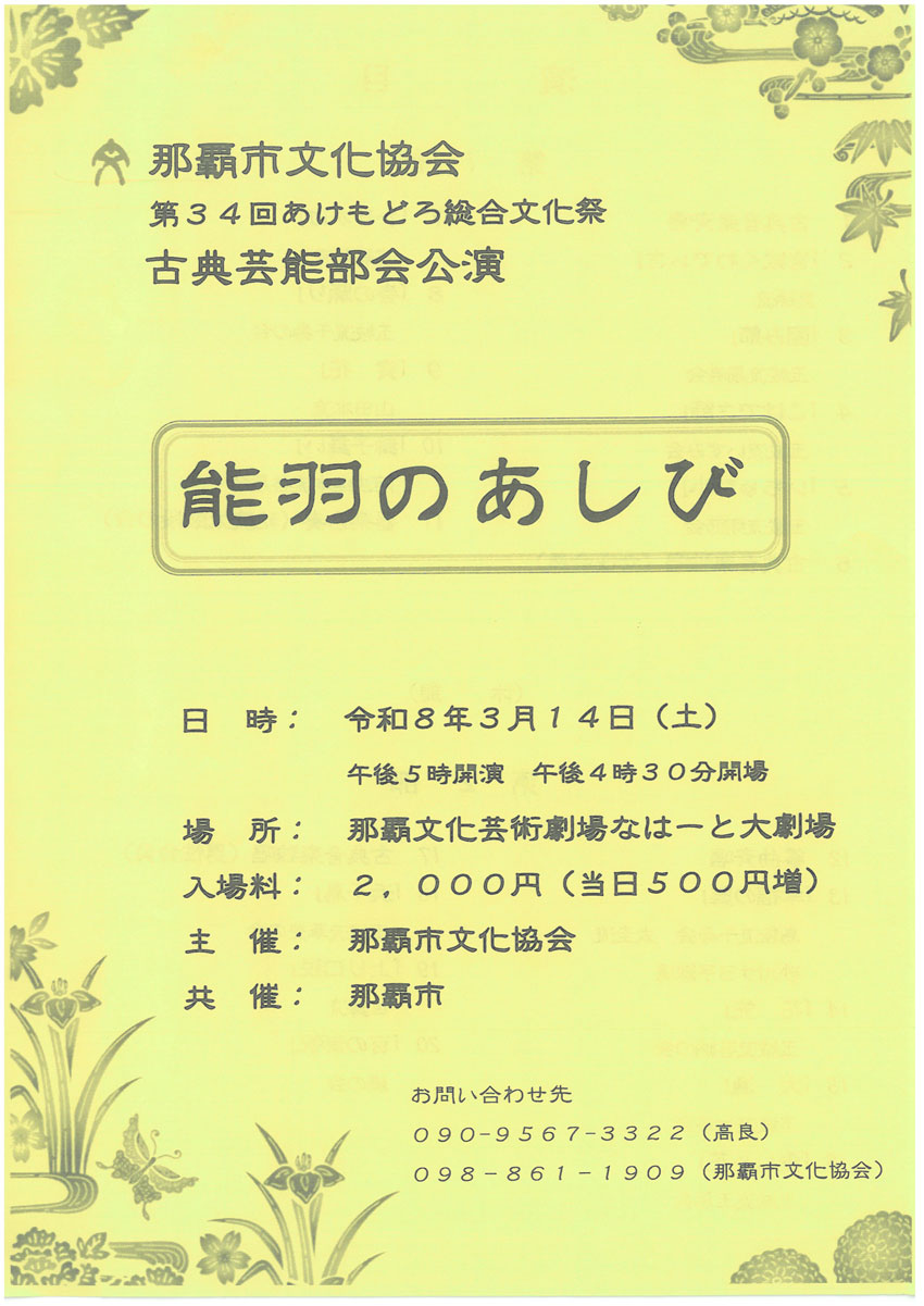 ★那覇市文化協会・第34回 あけもどろ 総合文化祭・古典芸能部会 『~能羽のあしび〜』・開場:16時30分/開演:17時・会場=那覇文化芸術劇場なはーと・大劇場