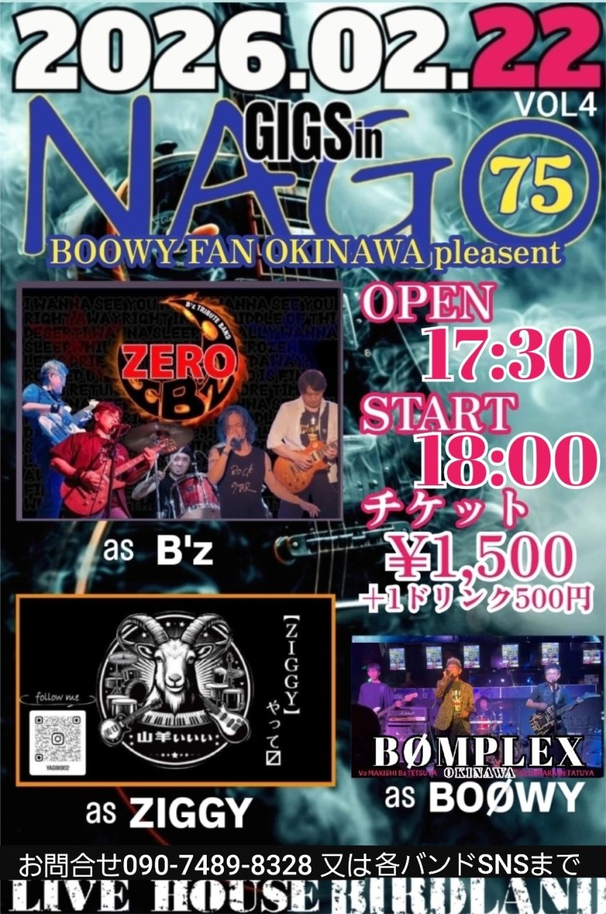 ★GIGS in NAGO BOOWY FAN OKINAWA pleasent・開場:17時30分/開演:18時・出演=B’z、ZIGGY、BOOWY・会場=LIVEHOUSE 名護 BIRDLAND