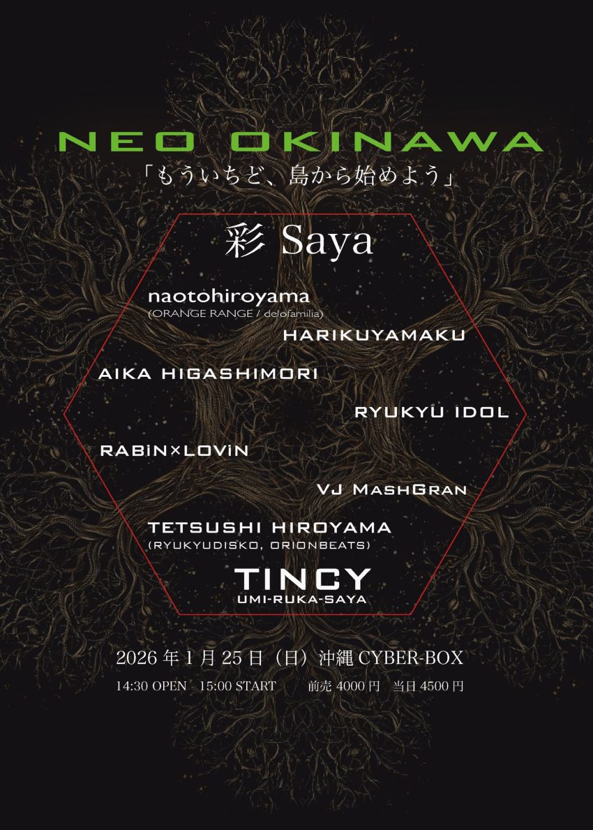 ★NEO OKINAWA 〜もういちど島から始めよう・開場:14時30分/開演:15時・出演=彩Saya (ex 沖縄電子少女彩) / naotohiroyama / 東盛あいか / RYUKYU IDOL / RABiN×LOViN / 廣山哲史 / Tincy・会場=Cyber-Box