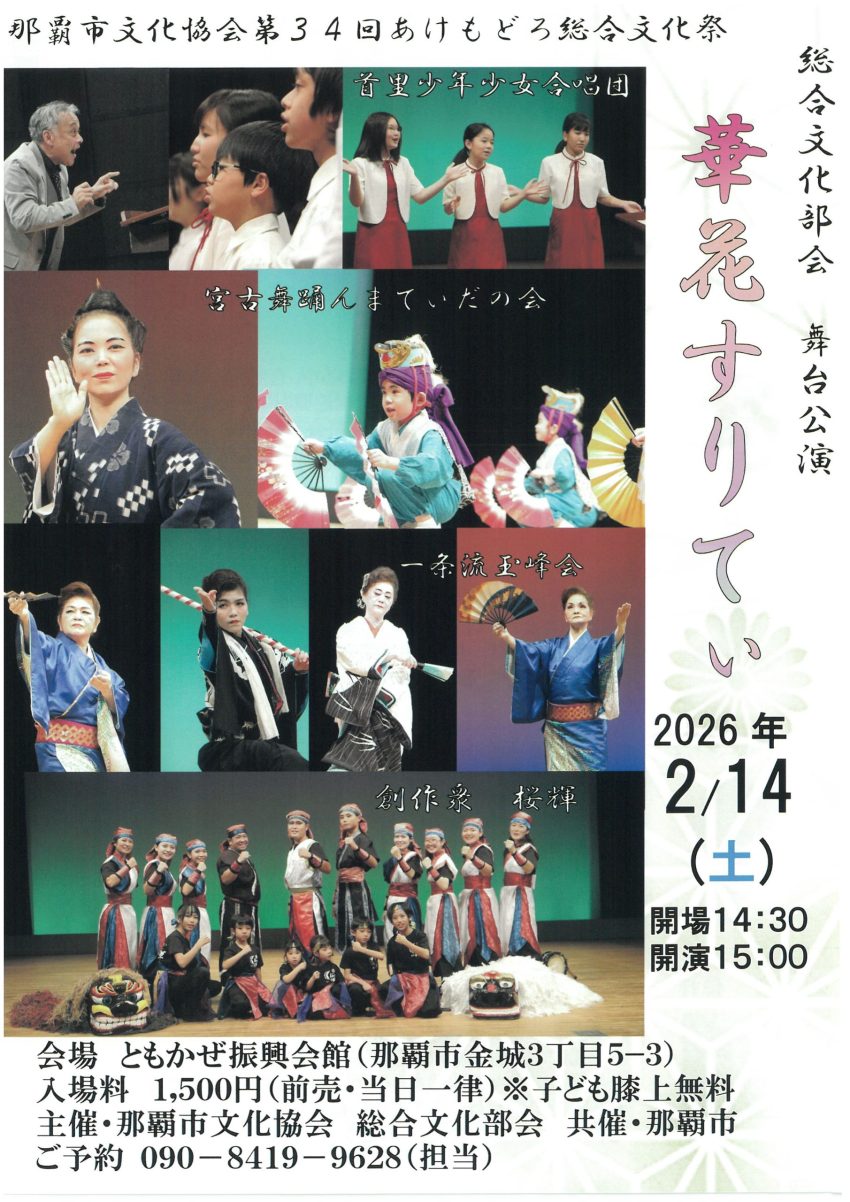 ★那覇市文化協会・第34回 あけもどろ 総合文化祭・総合文化部会『華花すりてぃ』・開場:14時30分/開演:15時・会場=ともかぜ振興会館(那覇市金城3丁目5番地3)