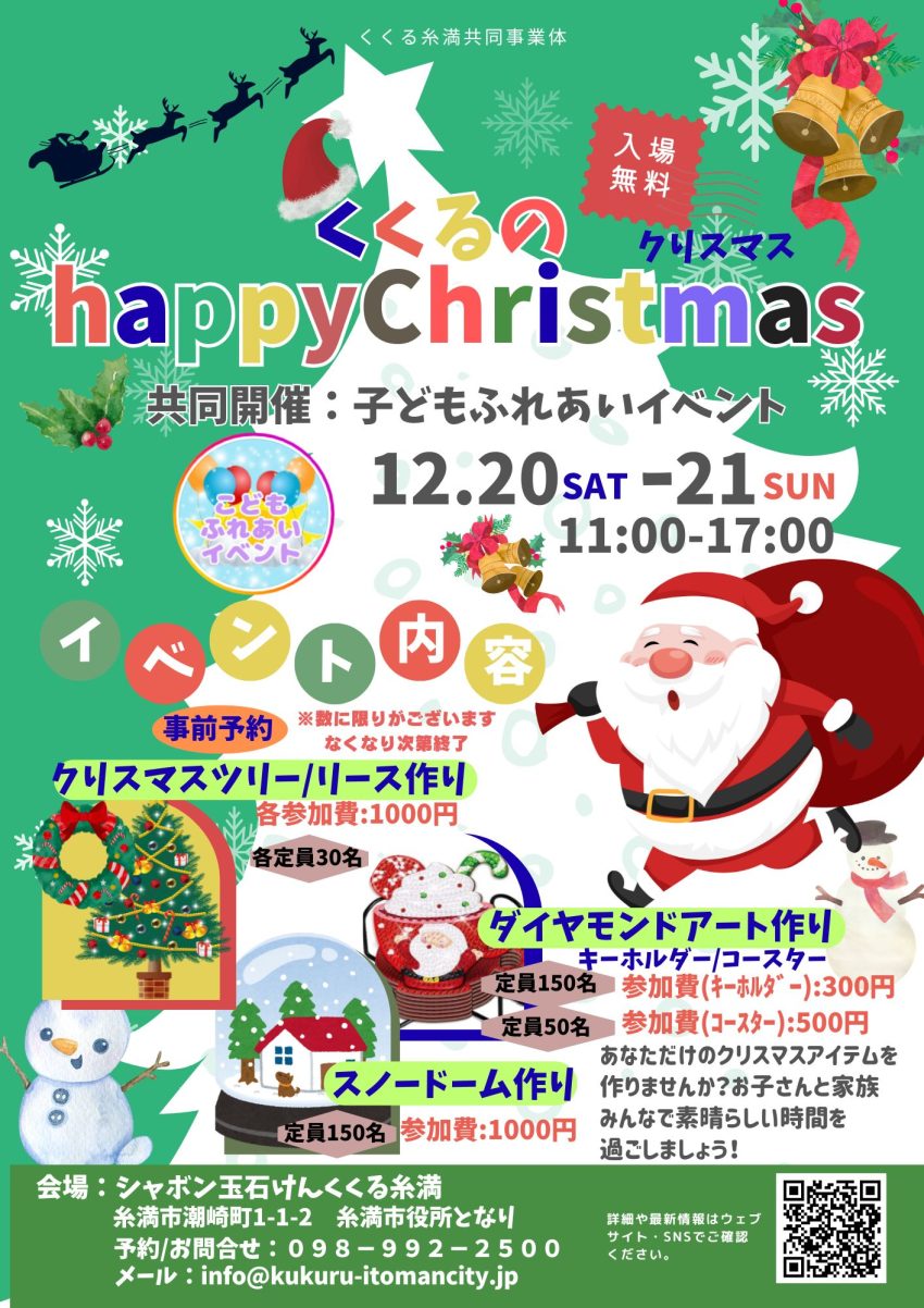 ★くくるのHappy christmas・11時~17時・屋外ステージイベント出場者=大里中学校ダンスクラブ BLACKMONSTER、チアダンスZEALS、Kumpey~featuringRyupon、BerylDanceStudio、大里青年会・会場=シャボン玉石鹸くくる糸満
