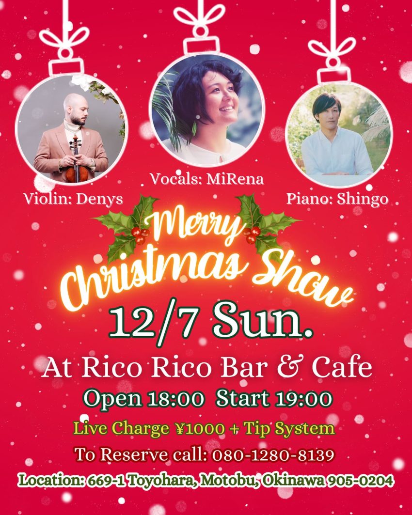 ★Merry Christmas Show・開場:18時/開演:19時・出演=Violin: Denys、Vocals: MiRena、Piano: Shingo・会場=RICORICO(CAFE&BAR)(本部町豊原669-1)