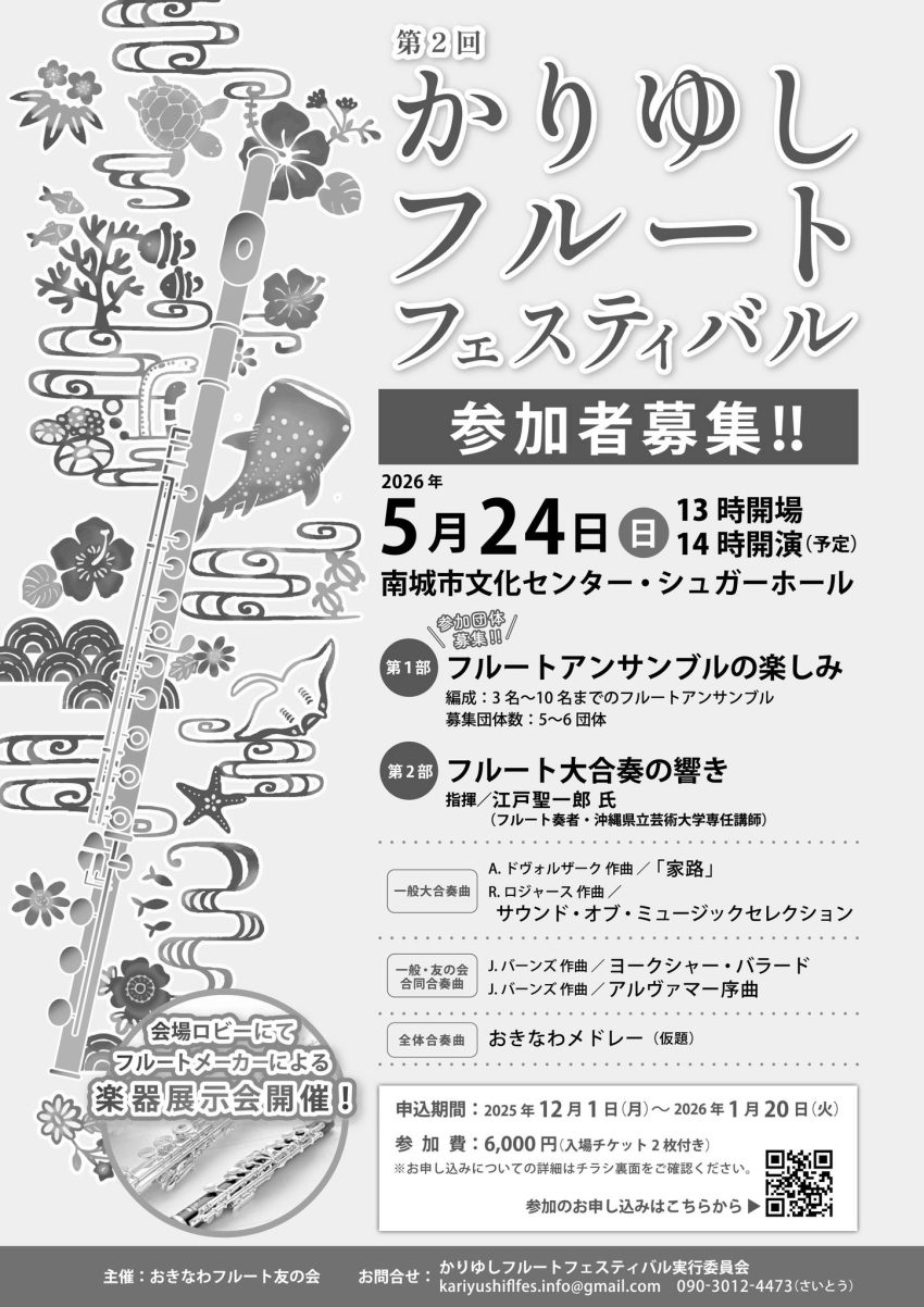 ★かりゆし フルートフェスティバル・開場:13時/開演:14時・出演=編成:3名~10名までのフルートアンサンブル、募集団体数:5~6団体・指揮/江戸聖一郎氏(フルート奏者・沖縄県立芸術大学専任講師)・会場=南城市文化センターシュガーホール
