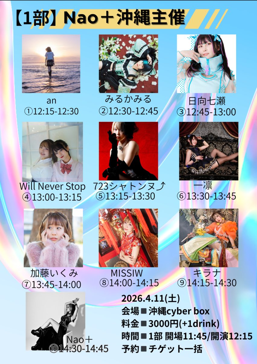 ★Nao+沖縄主催2026【1部】・開場:11時45分/開演:12時・出演=Nao+ / 加藤いくみ / 723シャトンヌ⤴︎ / 一凛 / キラナ / Will never stop / みるかみる / 日向七瀬 / MISSIW・会場=Cyber-Box
