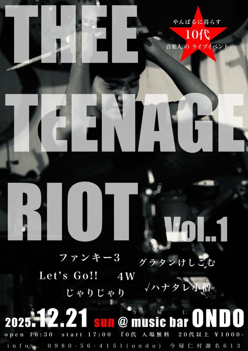 ★THEE TEENAGE RIOT VOL.1・開場:16時30分/開演:17時・出演=√ハナタレ小僧 (13才〜19才のドキドキ3人組)、4W (北山高校4人組プリティガールズバンド)、ファンキー3 (9才〜15才の4人組ファンキーバンド)、じゃりじゃり (今帰仁中2 & 小6 の全力ロック人組)、 Let’s Go !! (9才〜17才のイカしたガールズ&ボーイズ5人組バンド)、グラタンけしごむ (今帰仁中2の絶賛反抗期バンド )・会場=今帰仁村・Music bar ONDO